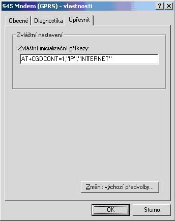 Upřesnit a do pole Zvláštní inicializační příkazy zapište at+cgdcont=1,"IP","INTERNET".