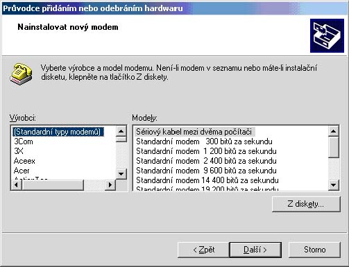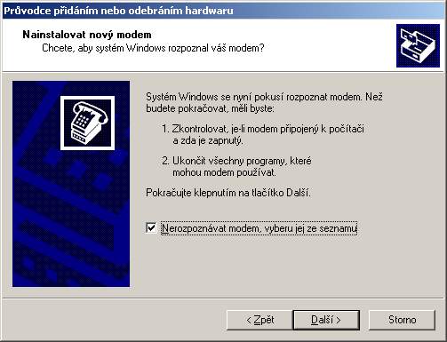 4. V tomto okně zaškrtněte položku Nerozpoznávat modem, vyberu jej ze seznamu a stiskněte Další.