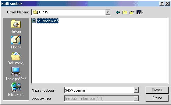 6. Vyhledejte soubor S45Modem.inf (buď na CD a nebo v místě, kam byl uložen z internetu) a potvrďte Otevřít