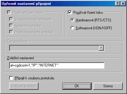 7. Do pole Zvláštní nastavení napište AT příkaz pro GPRS (viz. obrázek)