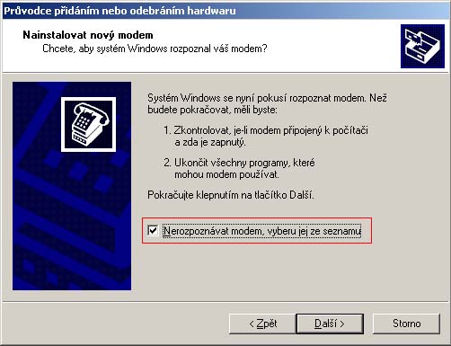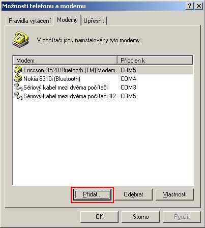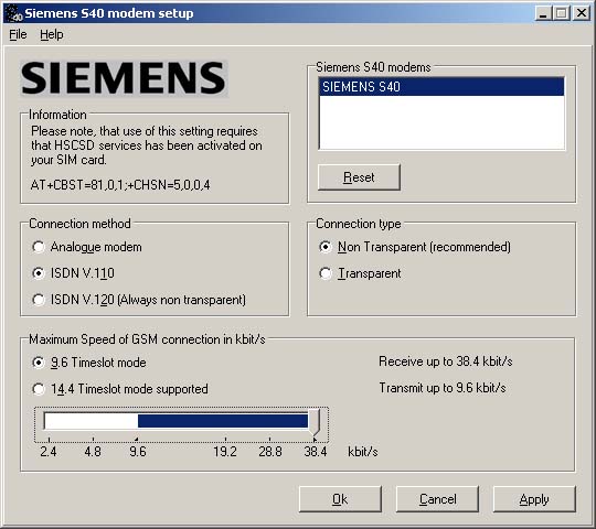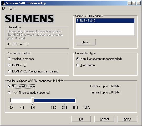 podle pokynů instalace (viz obrázky)![]() ![]() ![]() ![]() ![]() Kliknutím na Finish dokončíte instalaci 2. Po instalaci softwaru je nutno ještě ručně nainstalovat modem pro daný typ telefonu Otevřete si Start - Nastavení - Ovládací panely - Modemy (ve Win 2000 - Vlastnosti telefonu a modemu) a klikněte na Přidat... ![]() Zaškrtněte červeně označenou položku a klikněte na Další ![]() V nabídce Výrobců vyberte Siemens a model Siemens S40. Pokračujte kliknutím na Další ![]() Klikněte na COM port, na kterém máte připojený telefon, a pokračujte kliknutím na Další ![]() Ve Windows 2000 se ukáže následující informace k instalaci modemu, kterou potvrdíte Ano ![]() Instalaci modemu dokončíte kliknutím na Dokončit ![]() Po dokončení instalace už vidíte modem v seznamu nainstalovaných modemů v PC ![]() 3. Nyní je nutno modem nastavit na přenosy HSCSD Spusťte nainstalovaný program v bodě 1. Start - Programy - Siemens S40 Modem - S40 Modem Settings ![]() Proveďte nastavení rychlosti na 38,4 kbit/s. Jakmile začnete hýbat jezdcem na liště, ukáže se následující upozornění (viz obr.) ![]() Program upozorňuje na to, že pro tuto volbu je nutno mít u provozovatele sítě zapojeny HSCSD přenosy (u ET je mají všechna čísla automaticky, pokud mají data). Potvrďte Yes a nastavte rychlost na maximum (viz obr.) ![]() Nyní už jen potvrďte OK. Program se zeptá, jestli chcete toto nastavení uložit (viz obr.) ![]() Klikněte na Yes, tím je nastavení modemu hotové 4. Ještě nastavte telefonické připojení sítě pro Windows 95/98/ME (Budete pokračovat už jen krokem č. 2) 5. Po ukončení tohoto kroku pak nesmíte zapomenout ve vlastnostech tel. připojení odškrtnout směrové číslo země [viz např. první body zde] |