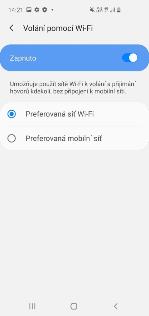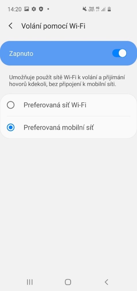 Wi‑Fi volání bude fungovat i v případě, kdy zvolíte možnost Preferovaná mobilní síť. Pokud bude mobilní signál špatný nebo žádný, hovory se uskuteční přes Wi‑Fi.