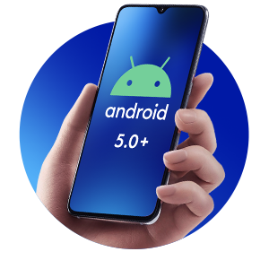 • v rukou držící telefon, na jehož displeji je zobrazena ikona Androidu a text 5.0, znamenající verzi operačního systému Android