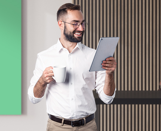 muž v bílé košili stojí v kanceláři, v jedné ruce drží hrnek s kávou a v druhé papíry, ze kterých si čte
