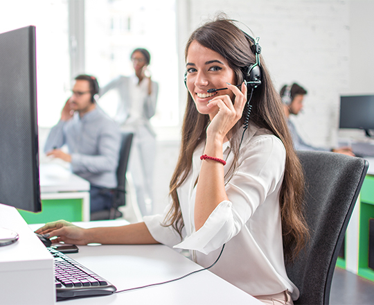 žena operátorka, sedí u počítače a zrovna s někým na lince vesele hovoří