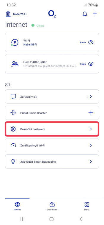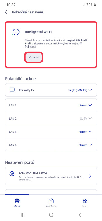 Vypnutí funkce Inteligentní WiFi provedete pomocí aplikace O2 Smart Box. V sekci Internet přejděte do Pokročilá nastavení.