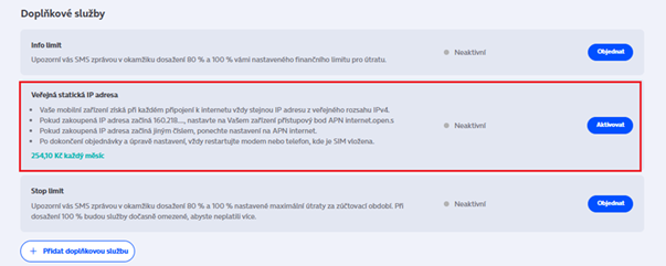 Po aktivaci nebo deaktivaci doplňkové služby „Veřejná statická IP adresa“ vždycky restartujte modem.