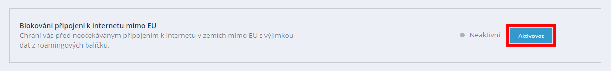 Když nechcete datový roamingový balíček (viz krok 5) a chcete mít data zpoplatněná podle jejich čerpání, je potřeba mít službu „Blokování připojení k internetu mimo EU“ naopak ● Neaktivní.