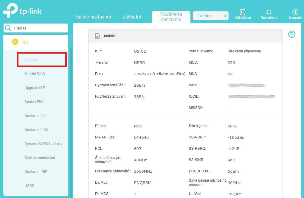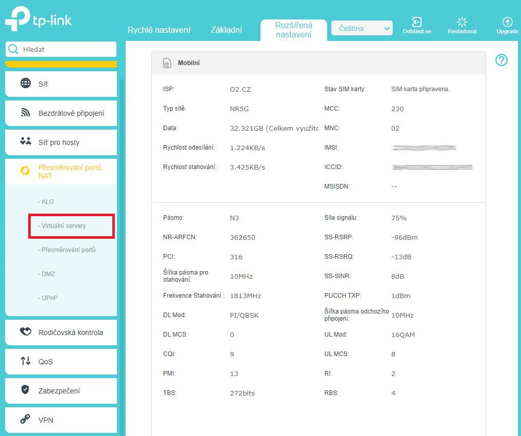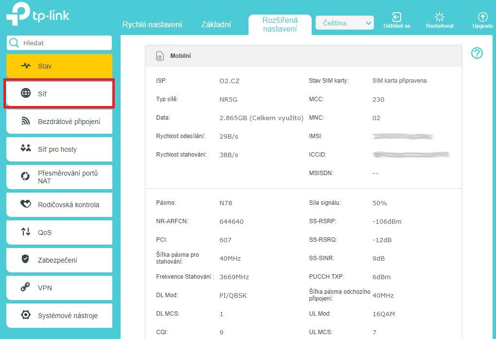 Dostaneme se na základní rozcestník nastavení TP-LINK NX510v. Klikneme na Rozšířená nastavení.