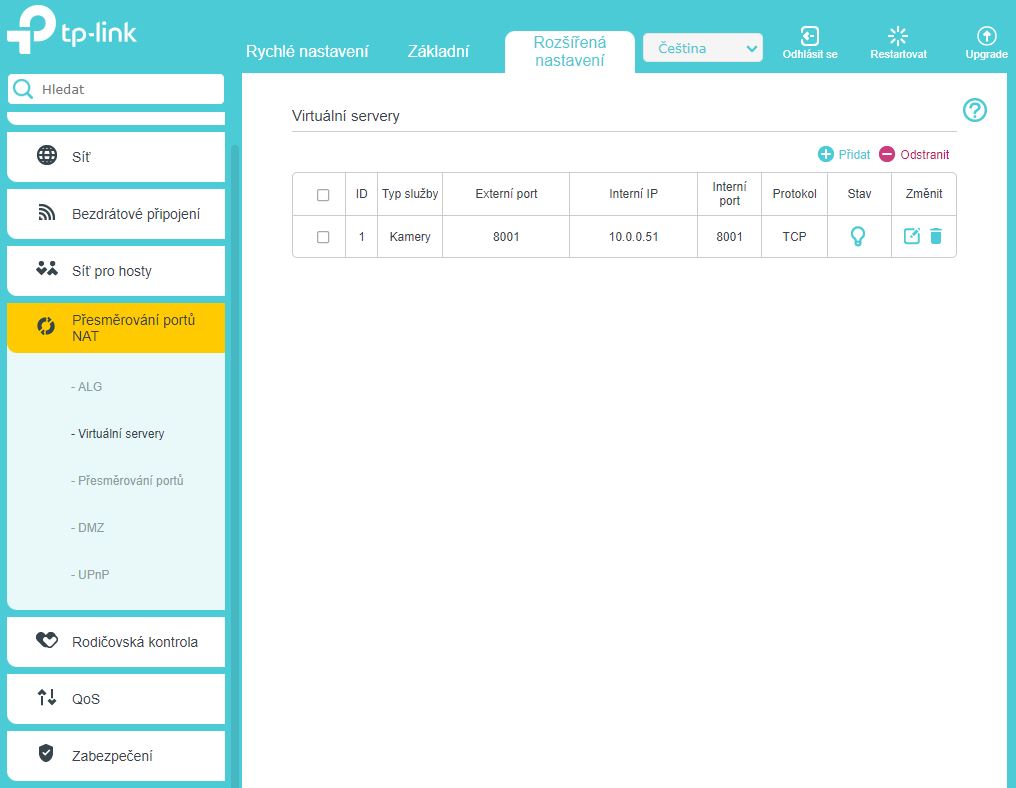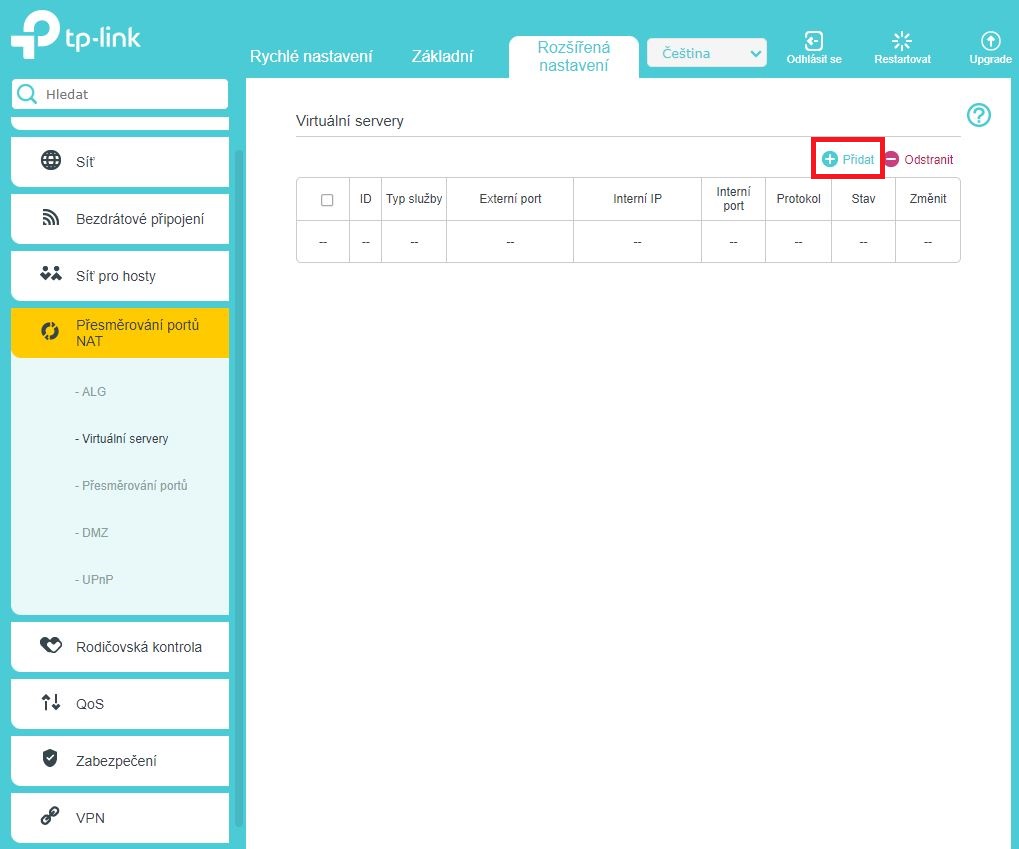 Na této kartě klikneme na volbu Přesměrování portů NAT.