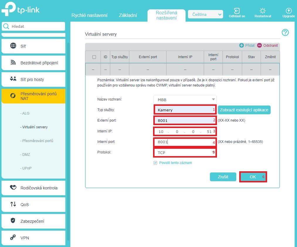 Do pole Externí port 2 vyplníme požadovaný port. Do pole Interní IP 3 vyplníme IP zařízení na které chceme směrování uplatnit. Do pole Interní port 4 vyplníme požadovaný port. U pole Protokol 5 vybereme požadovanou hodnotu (TCP, UDP, nebo VŠE – oba protokoly) a potvrdíme tlačítkem OK 6.