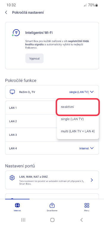 Žlutě označené LAN porty O2 Smart Boxu jsou z výroby nastavené: LAN1, LAN3, LAN4 pro internet a LAN TV pro O2 TV. Kvůli rozdílné přenosové technologii je ale port LAN TV takto použitelný jen pro Pevný internet na doma (technologie xDSL), nikoliv pro Internet 5G (mobilní data).