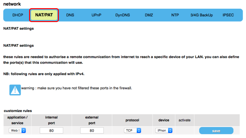Po přihlášení klikněte na NAT/PAT na liště menu Network Configuration: