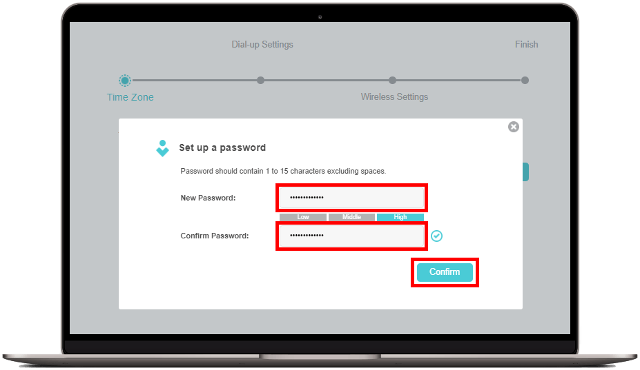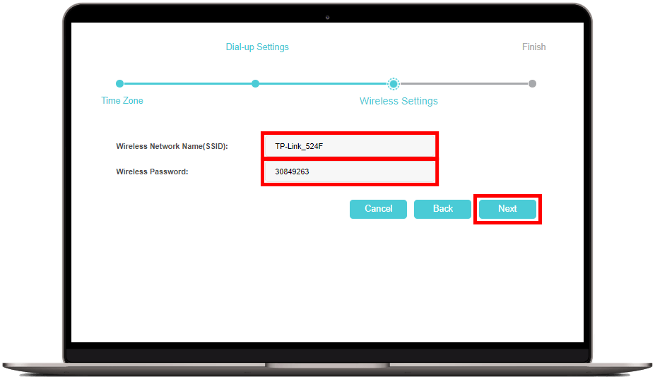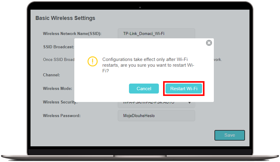 • Wireless Password = Napište heslo, kterým chcete svou Wi-Fi síť zabezpečit. Nepoužívejte diakritiku ani mezery.