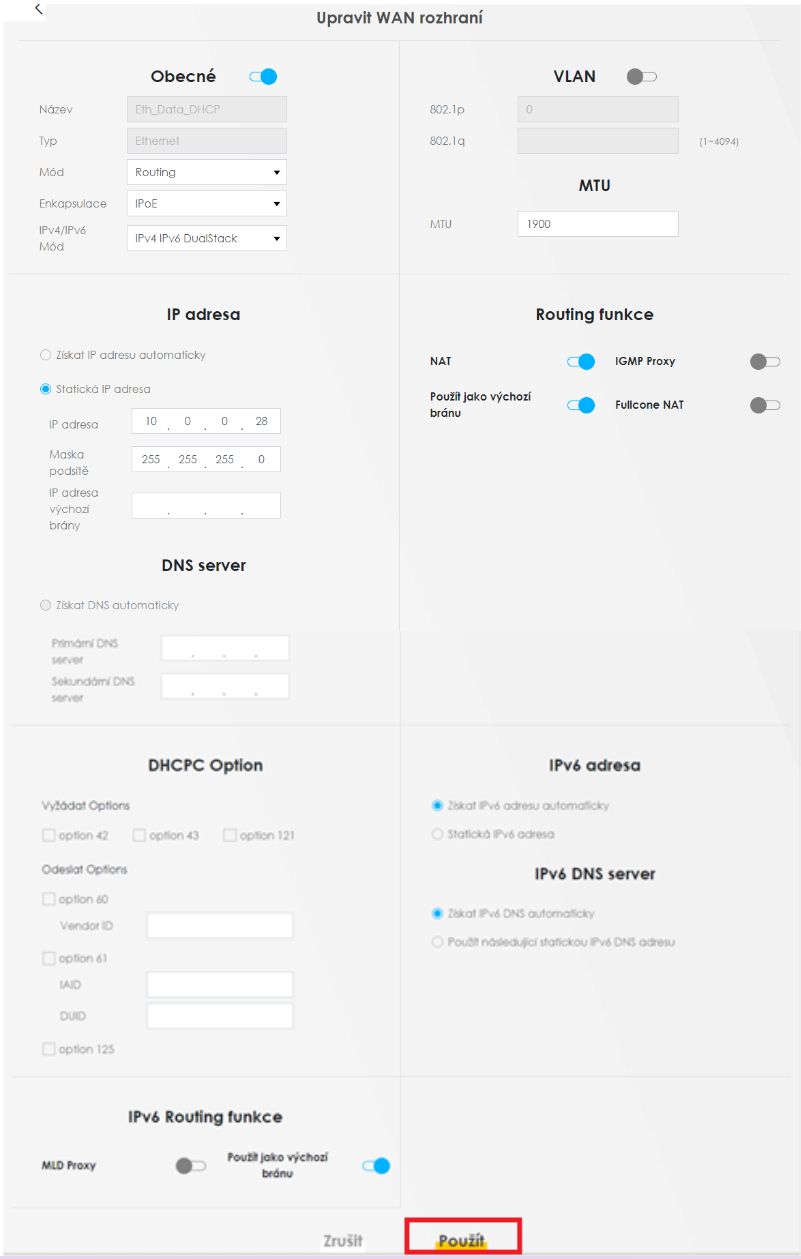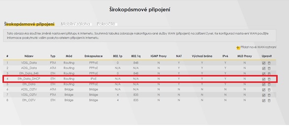 Pro nastavení WAN připojení klikněte na ikonu Upravit vedle existujícího WAN rozhraní. Vyberte ETH_Data_DHCP.