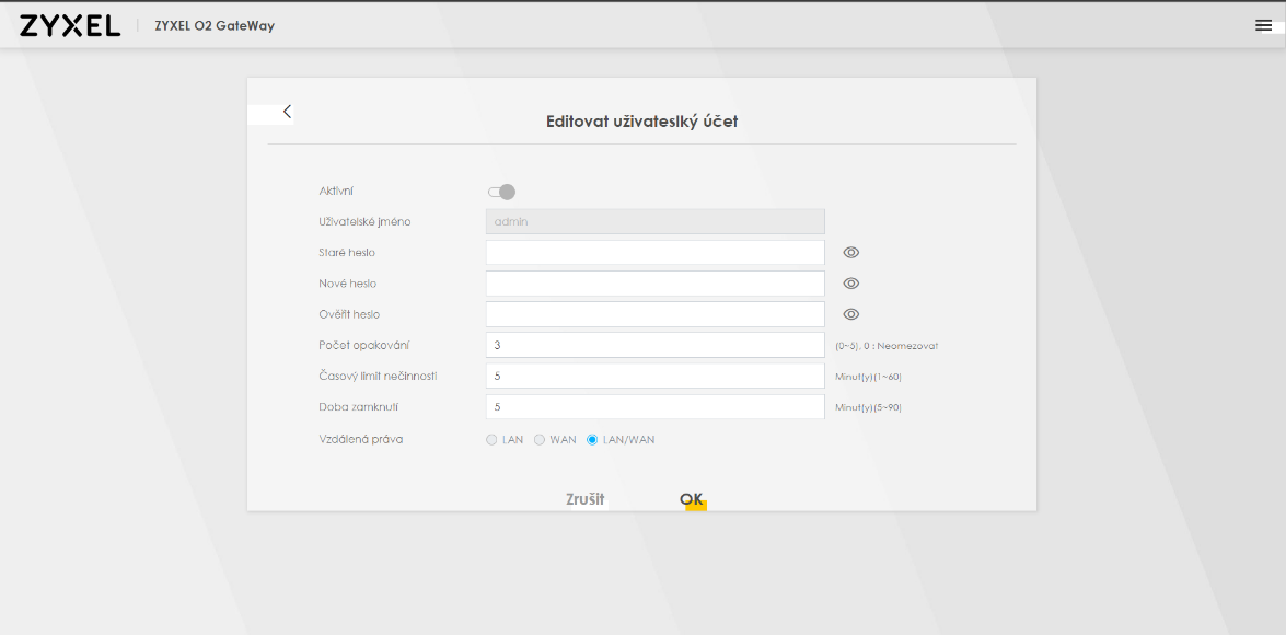 Z výroby má modem ZYXEL nastavené uživatelské jméno na hodnotu „admin“ a heslo je uvedené na štítku na spodní straně modemu. Přístupové údaje si můžete sami změnit, ochráníte tak nastavení svého modemu před cizím zásahem.