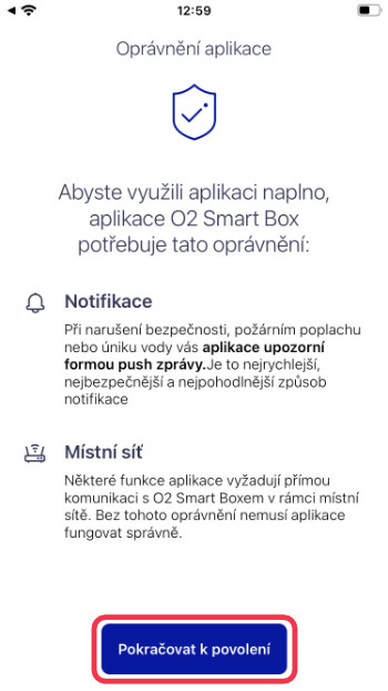 1. Na některých telefonech s operačním systémem iOS si aplikace může vyžádat určitá oprávnění, aby správně fungovala. Klikněte na "Pokračovat k oprávnění" a v dalším kroku na povolit.