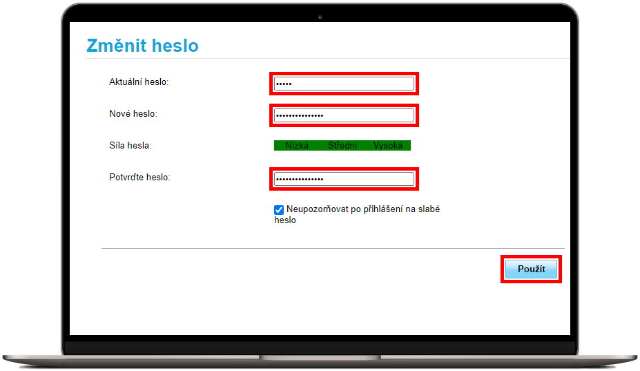 TIP: Pokud se přístupové heslo v minulosti měnilo a už si ho nepamatujete, /ODKAZobnovte modem do továrního nastavení/. Heslo „admin“ začne opět platit.