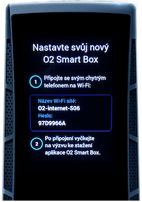 Vyhledejte v telefonu dočasnou Wi‑Fi síť uvedenou na displeji O2 Smart Boxu a připojte se k ní pomocí hesla, které je také zobrazené na displeji.