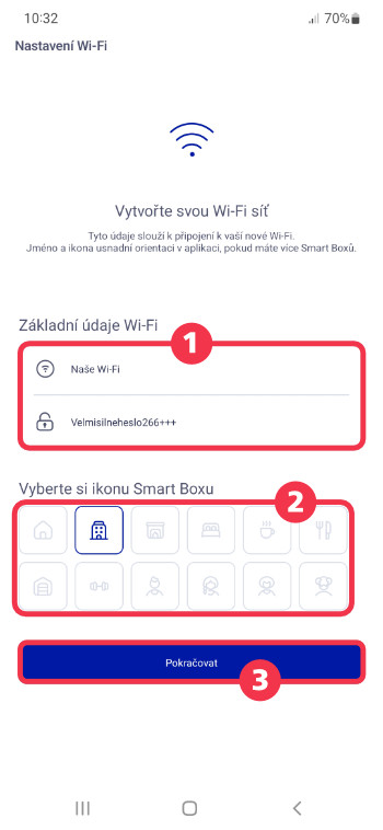 Vytvořte si vlastní název Wi-Fi sítě a její bezpečné heslo (1). Navíc si můžete i vybrat ikonu pro snazší orientaci v aplikaci (2), pokud budete mít více O2 Smart Boxů.