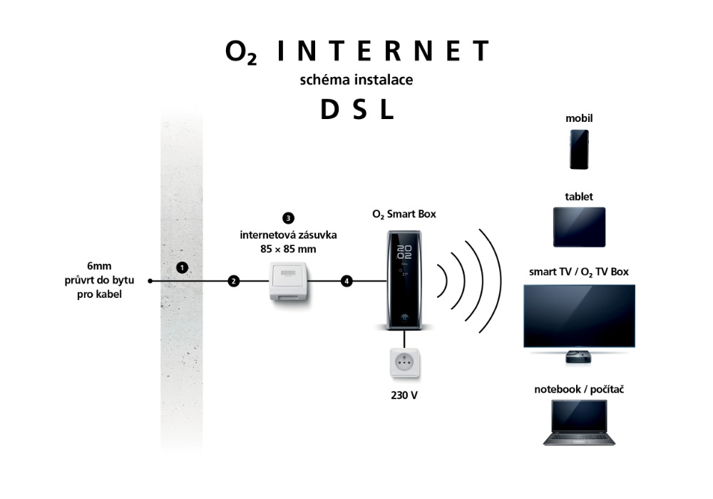| Schéma instalace pevného internetu od O2 |