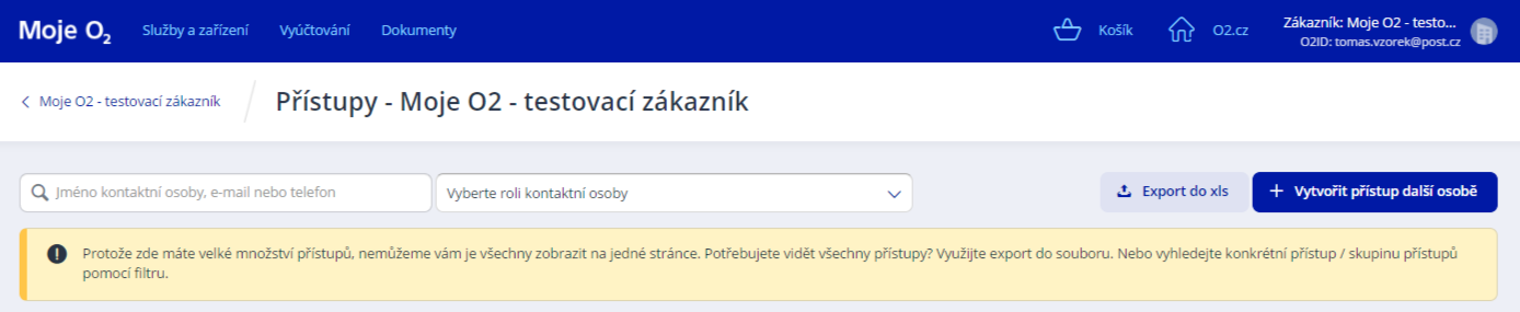 Pokud má vaše společnost víc než 50 kontaktních osob, neuvidíte jejich přehled na obrazovce, ale můžete vyhledávat pomocí jejich jména, e‑mailu nebo telefonu nebo filtrovat podle rolí. Seznam se dá i exportovat do XLS souboru.