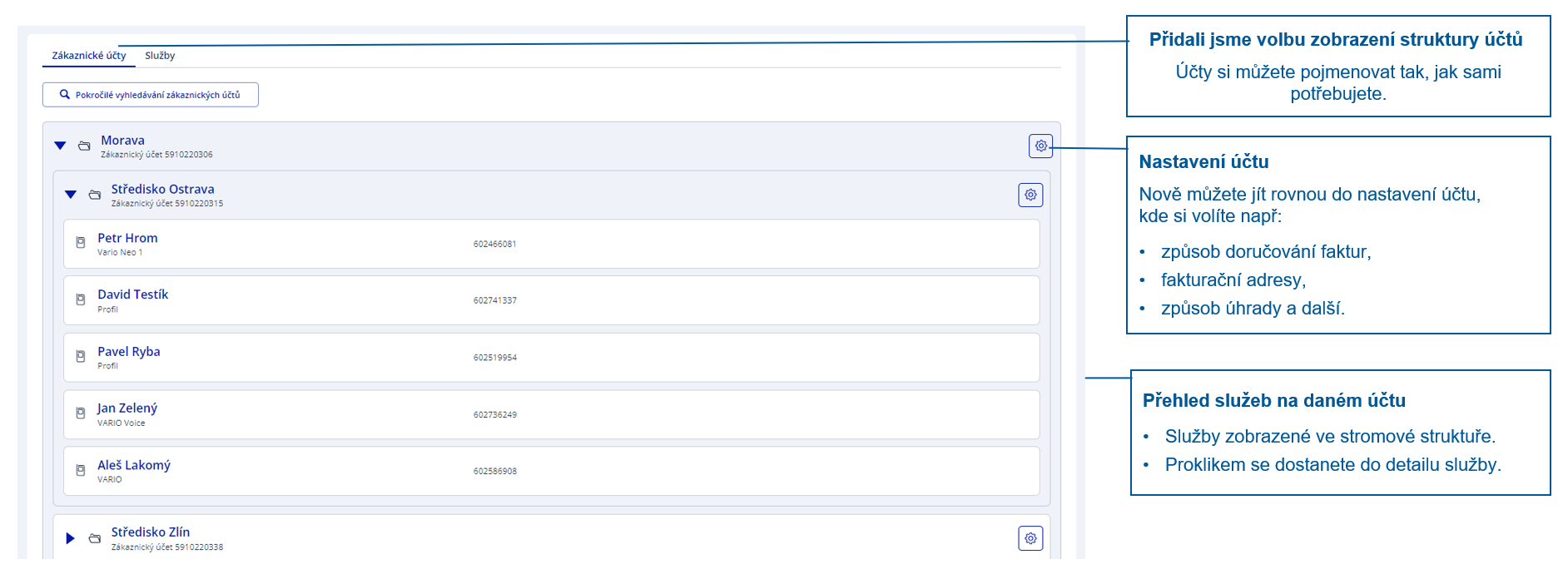 Najdete tu nový rozcestník pro obsluhu služeb u víc firem. Je tu možné hledat služby, vyúčtování i objednávky bez nutnosti proklikávat se na detail konkrétní obsluhované firmy.