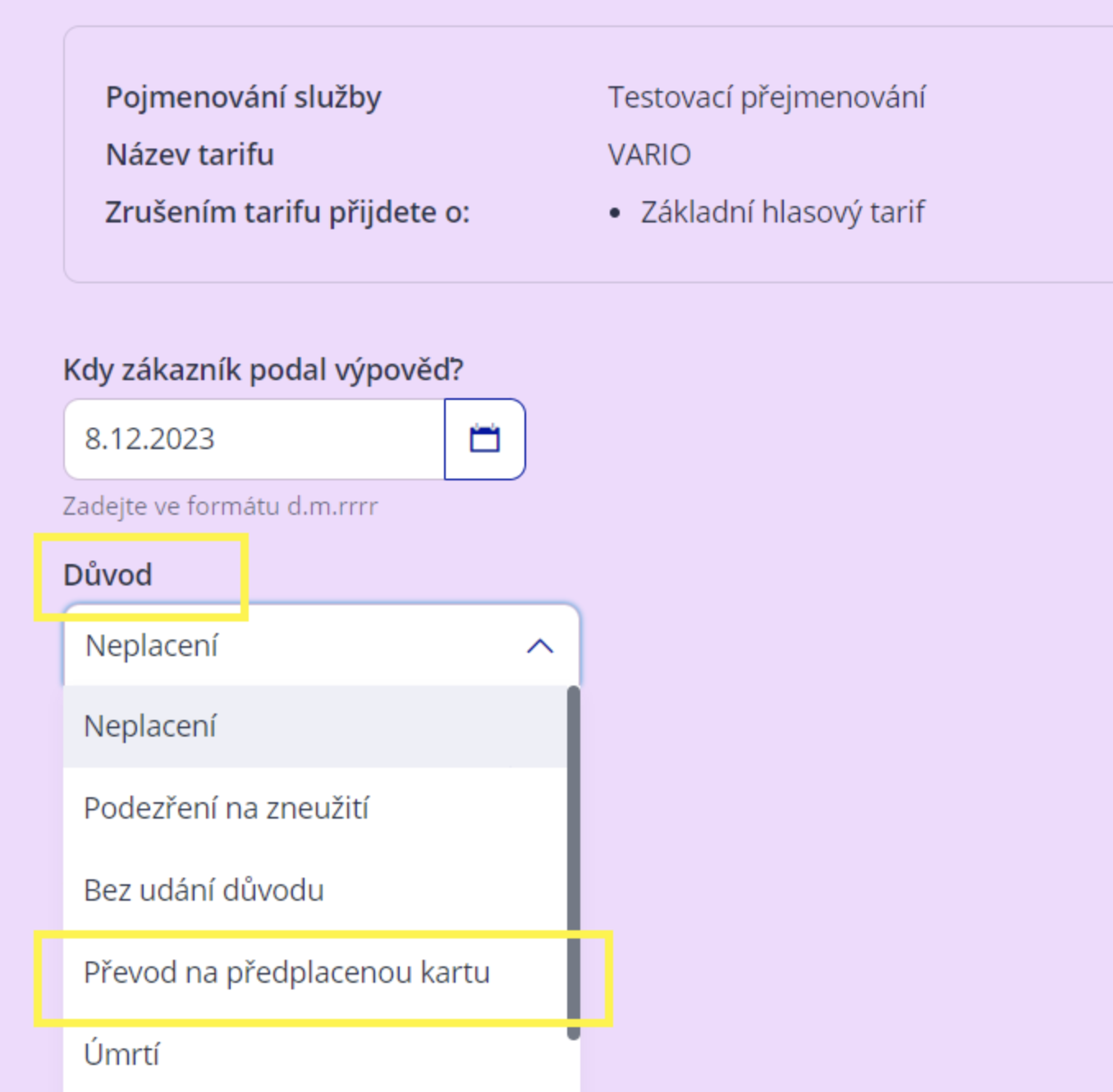 V záložce Důvod, vyberete „Převod na předplacenou kartu“