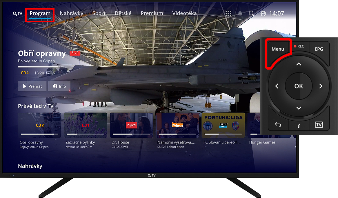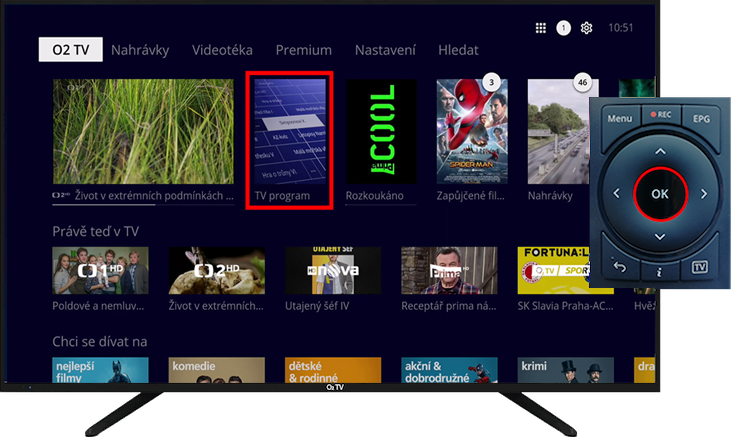První: stiskněte tlačítko „Menu“ na dálkovém ovladači a vyberte položky „Program“ v horním menu O2 TV.