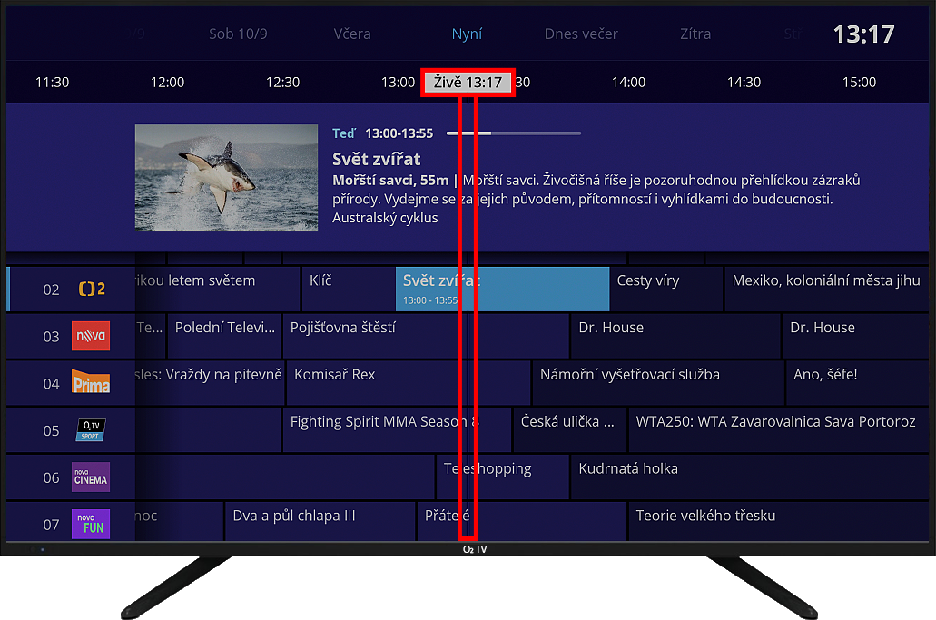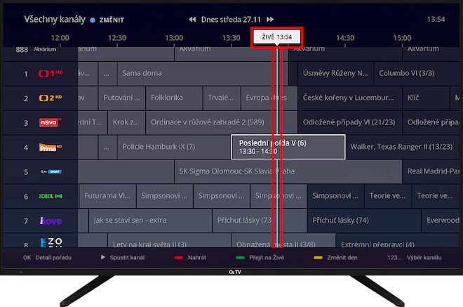 Aktuální vysílací čas zobrazuje bílá linka s nápisem „ŽIVĚ“.