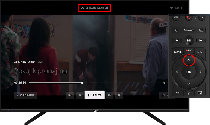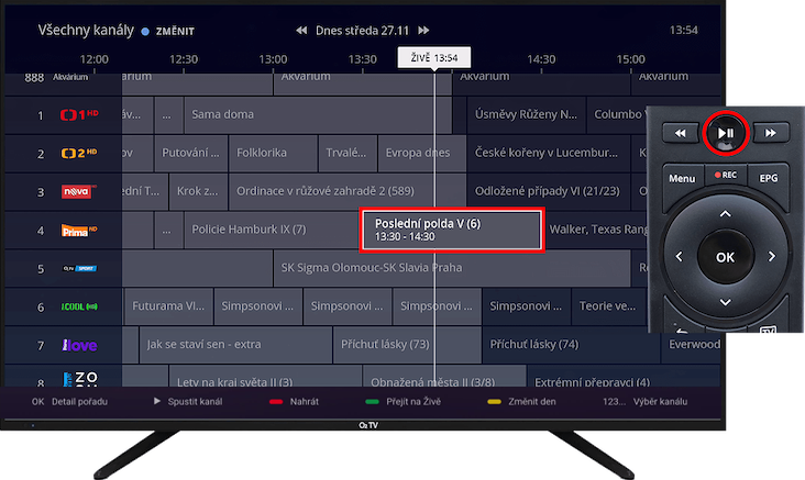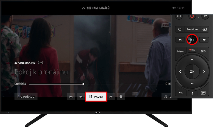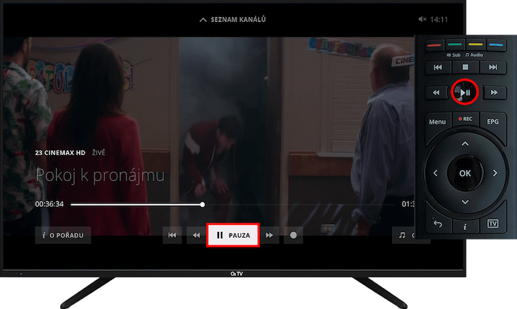 Tlačítko „play a pauza“ spustí pořad, u kterého právě jste.