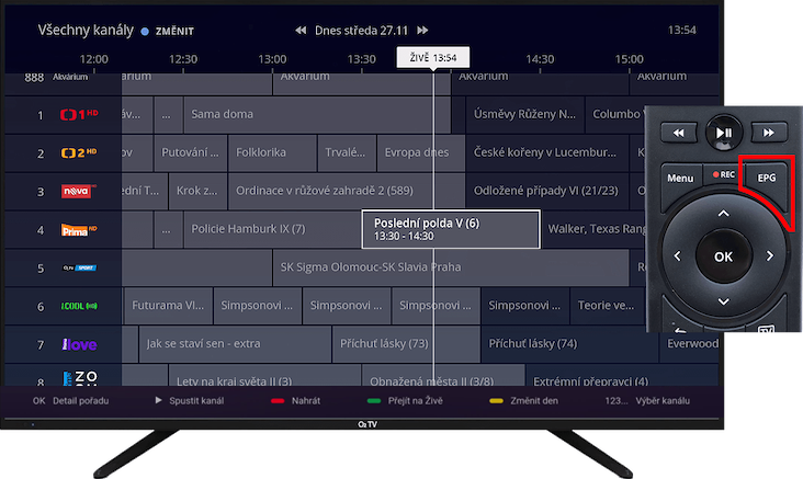 Tlačítkem „OK“ se zobrazí detail pořadu. Pořad můžete sledovat v aktuálním čase, pustit od začátku nebo nahrát.