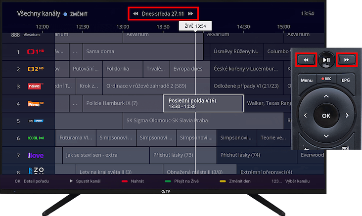 Stiskněte tlačítko „šipky“ na dálkovém ovladači a pořad si posuňte podle potřeby zpátky (skok po 30 sekundách). Když se budete dívat na pořad ze záznamu, můžete posouvat i šipkou dopředu. Všechno vidíte na časové lince ve spodní části obrazovky.