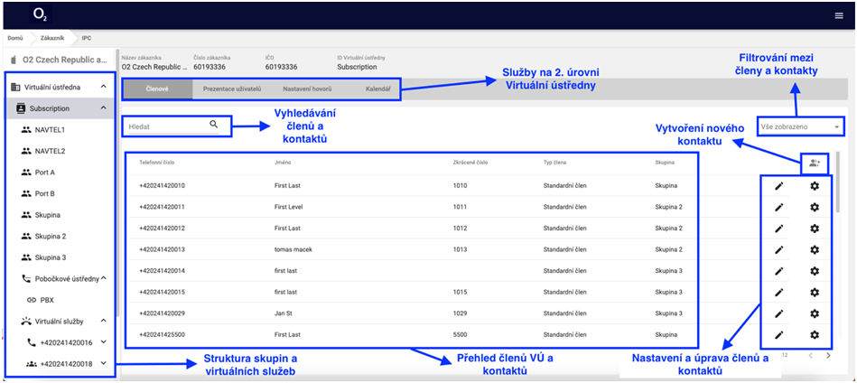 Členové jsou všechna standardní telefonní čísla s tarify VoIP Centrex, která jsou součástí Virtuální ústředny. Taky tu vidíte kontakty ve firemním telefonním seznamu a můžete je přidávat, mazat a upravovat. V kontaktech se pak vyhledává ve VoIP telefonu nebo aplikaci Call Manager.