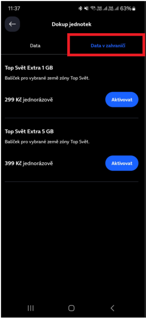 Přejděte na Data v zahraničí a zobrazí se dostupná nabídka balíčků.