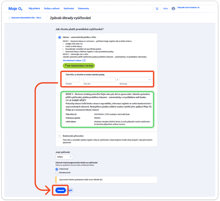 Přihlaste se do internetového Moje O₂. Klikněte na sekci Vyúčtování a dále na Nastavit vyúčtování. Pokud máte více zákaznických účtů (máte O₂ služby rozdělené do více faktur), vyberte ten, u kterého chcete inkaso nastavit. Případně postupně nastavte u všech.