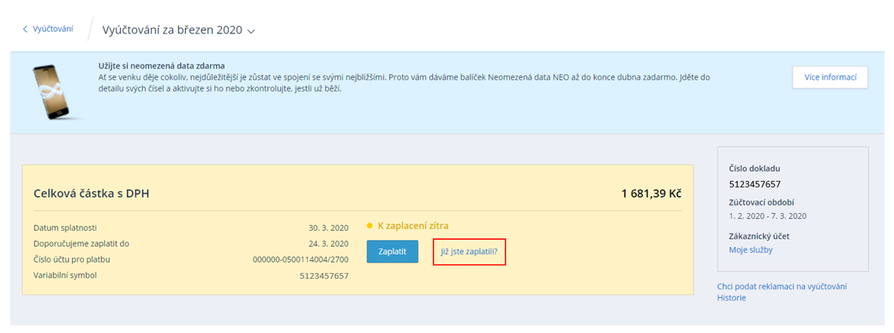 Tip: Stejný postup platí i pro situace, kdy při platbě za vyúčtování omylem zadáte špatné údaje, například jiný variabilní symbol.