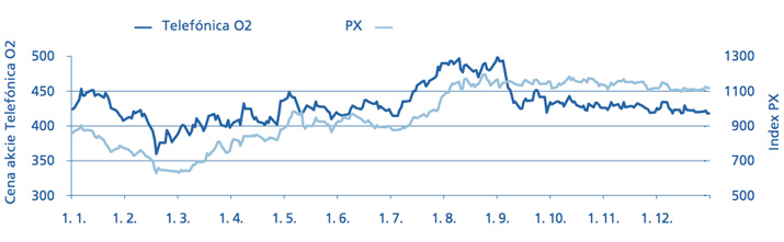 Vývoj ceny akcií Telefónica O2 a indexu PX v roce 2009