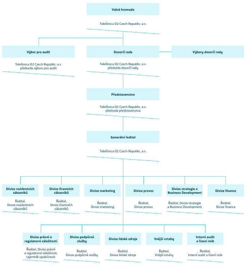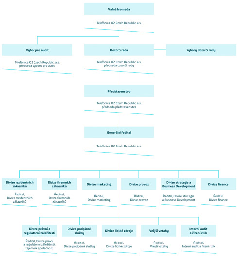 Telefónica O2 soustavně dbá na zvyšování efektivity své činnosti a zlepšování svého fungování. V uplynulém období proto proběhla další optimalizace architektury organizace a řízení společnosti. Na první úrovni výkonné liniové organizační makrostruktury došlo v roce 2010 k následujícím změnám: