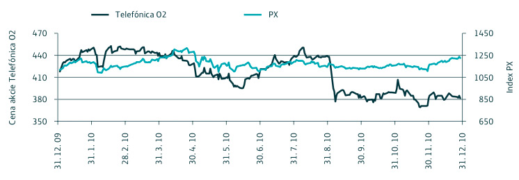 Vývoj ceny akcií Telefónica O2 a indexu PX v roce 2010
